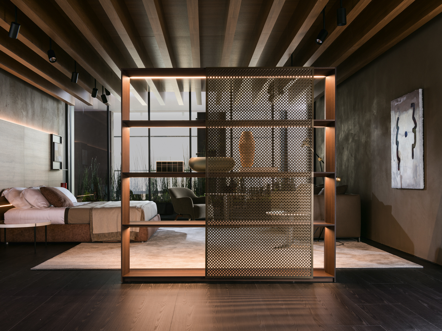 The design, featuring a single V-shaped profile, is used here both for the framework and for the bookshelves. As always, the use of innovative technological materials is what defines this project. Structural shelves made of plywood panels, reinforced with aluminium and then folded.