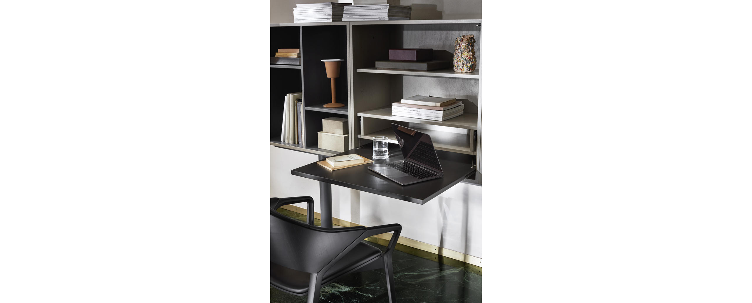 The Casiers Standard formed part of a project for residential furniture by Le Corbusier and Pierre Jeanneret for the Pavillon de l’Esprit Nouveau at the Paris Exposition des Arts Décoratifs in 1925. Here, the cousins Jeanneret went beyond the traditional concept of furniture, introducing these modular storage units, alongside a number of other movable pieces. Unique and timeless, conceived to confer an architectural look to their environment, these units could accommodate a wide array of objects in a particular context, even going so far as to create partition walls. The Casiers Standard were relaunched in 2016, with a more contemporary look. Enhanced so as to be more versatile and functional than ever before, they are available in eighteen fixed compositions. These are based on a 75 x 75 x 37.5cm module that contains shelves, each of these featuring five height options; legs are supplied in two versions: four slim-line chromed pilotis, or two painted round pedestal bases.
